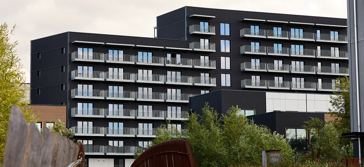 Developed by Citu in partnership with one of Scandinavia’s leading architectural practices, White Arkitekter, and civil and structural engineers Civic, the Climate Innovation District is not only boosting the supply of high quality urban housing, but actually creating an entire new sustainable neighbourhood. Over 500 low energy homes with integrated amenities have been created, with a design that has been PHPP (Passive House Planning Package) assessed. The development’s two apartment buildings, known as volumes, are constructed using a steel structure with composite metal deck floors and a light gauge steel framing system. This facilitates a RVF featuring two types of Swisspearl products externally, both with a fibre cement composition. Each volume, named Aire Lofts and District Lofts, takes the form of a multi-storey residential building up to 10 floors in height, providing various types of apartments. EJOT CROSSFIX® was selected to provide the critically important substructure because it enabled the construction of a highly insulated façade without compromising aesthetics, with the added benefit of streamlining installation.